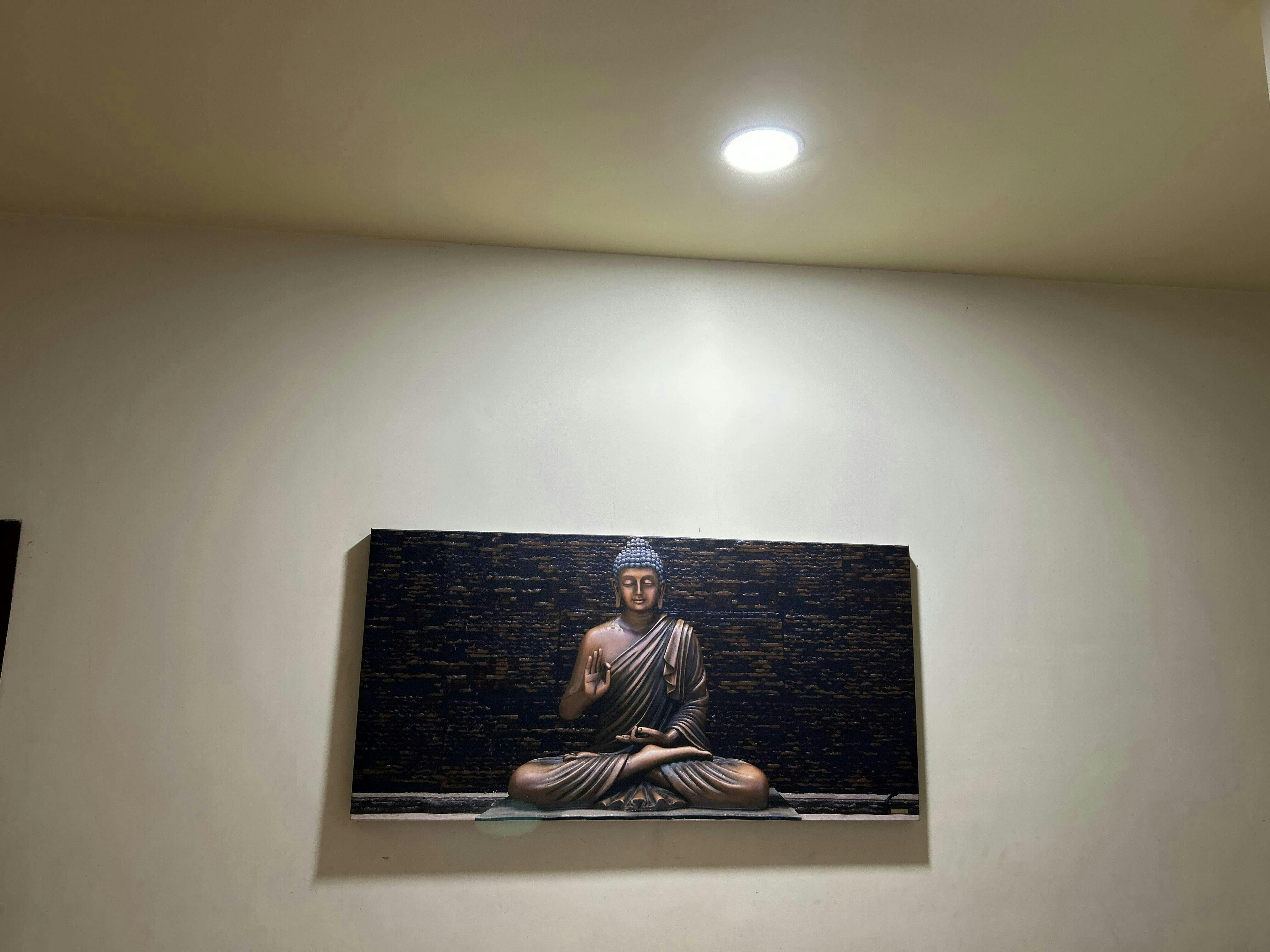 The Buddha Canvas Wall Painting is a blend of traditional symbolism and contemporary elegance. Printed or hand-painted on durable, high-quality canvas, it ensures long-lasting vibrance and beauty. The canvas texture adds depth to the painting, enhancing the lifelike presence of the meditating Buddha statue. Its design makes it versatile, perfectly fitting modern homes, minimalist interiors, and spiritual spaces alike.